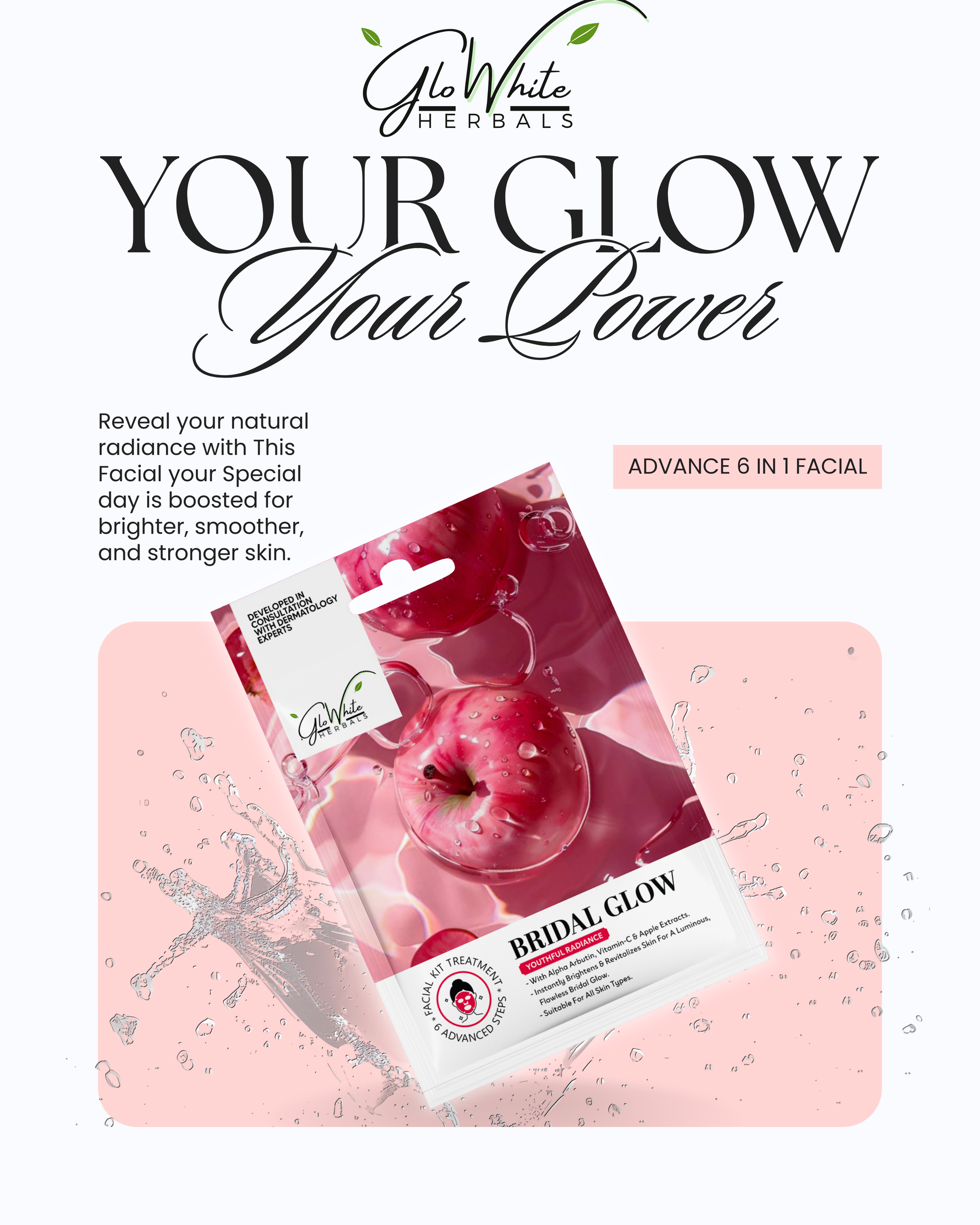 Get radiant, glowing skin for your special occasions with the Glowhite Herbals Bridal Glow Facial Kit, a luxurious 6-step professional facial treatment designed to enhance skin brightness and reveal a flawless glow. This advanced facial kit is infused with powerful brightening ingredients including Alpha Arbutin, Vitamin C and Apple Extracts. Alpha Arbutin helps improve uneven skin tone and reduce dullness, while Vitamin C enhances skin radiance and promotes a brighter complexion. Apple extracts help refresh and revitalize tired skin, leaving it smooth and glowing. The facial follows a carefully structured 6-step salon facial routine that includes cleansing, exfoliation, relaxing massage, nourishing face packs and sun protection. This complete skincare ritual helps remove impurities, refine skin texture and boost natural glow. Glowhite Herbals facial kits are dermatologically tested and developed with professional skincare standards, ensuring safe and effective results. Perfect for pre-bridal skincare, salon facials and home beauty treatments, this single-use facial kit delivers visible glow, smoother skin texture and long-lasting radiance. With regular use, skin appears brighter, healthier and naturally luminous.